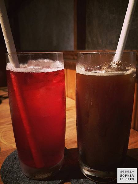 【(左)洛神氣泡冰茶、(右)黑糖古梅蘇打】